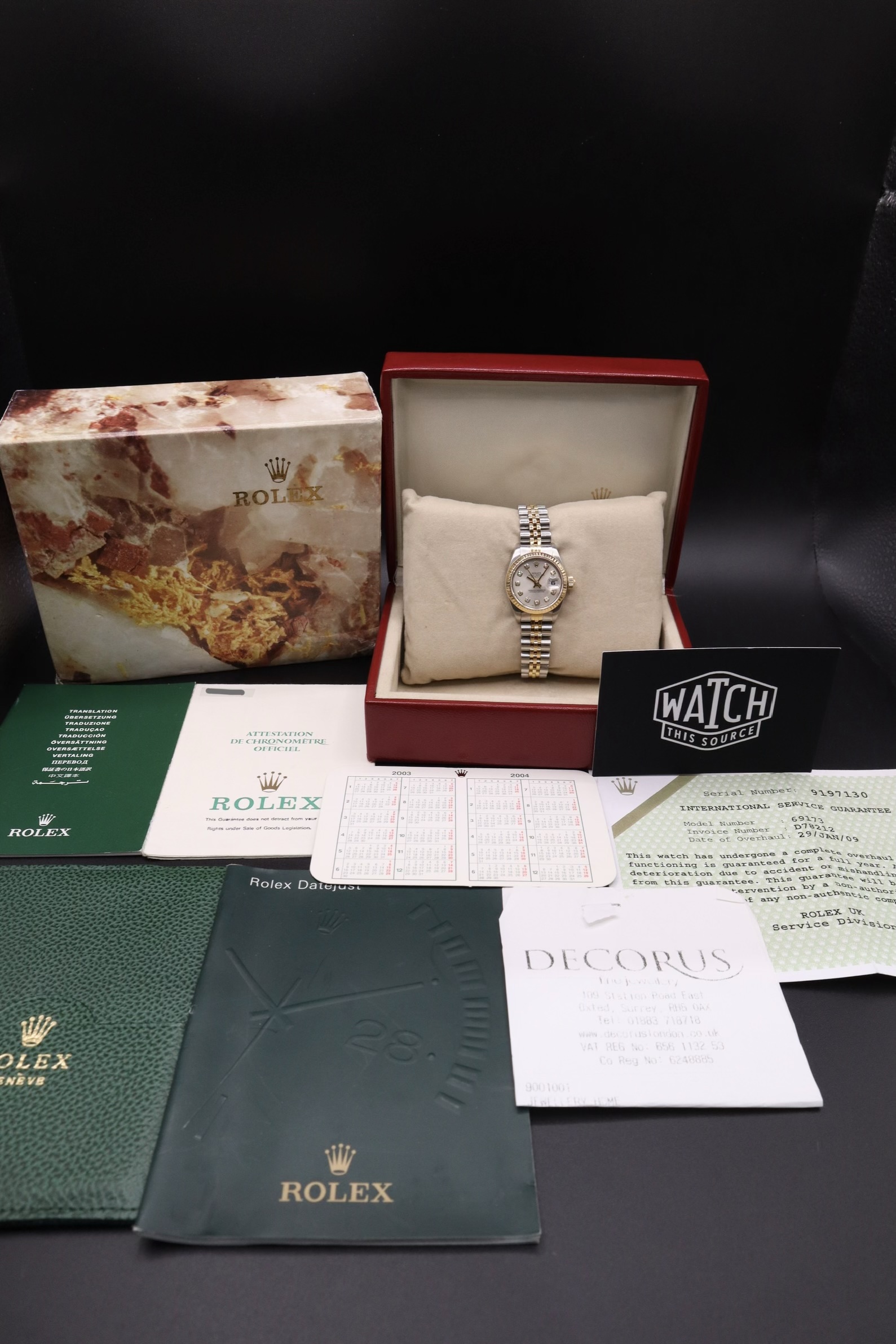 Contents: Inner box, outer box, manual, wallet, Rolex service papers from 2009, Rolex calendar.